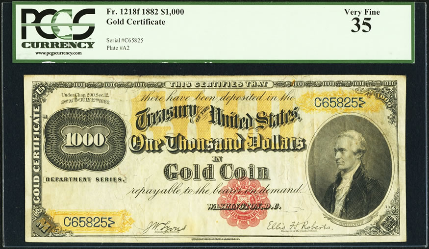 Heritage’s Platinum Currency Auction will present the finest known 1882 $1,000 Gold Certificate, PCGS, Very Fine 35.