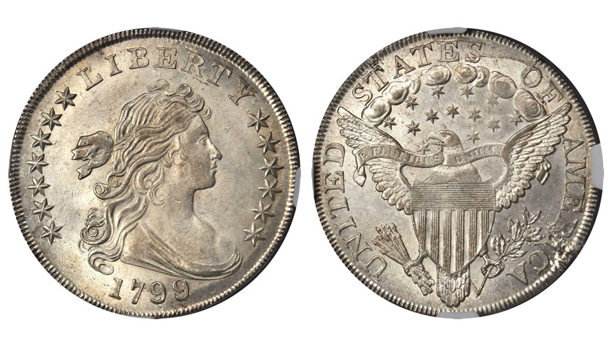 Numerous important silver dollars accompany this rarity, including the incredible MS-64 (NGC) 1799/8 Draped Bust example in lot 2188 that has a provenance to the Cardinal Collection and is also the plate coin for the BB-142 variety in Q. David Bowers’ reference on the series.