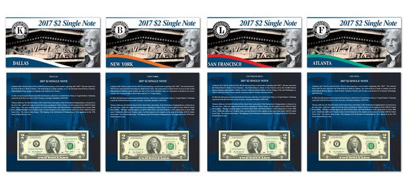The product includes $2 single notes from four different Federal Reserve Banks. Each of them features non-matching serial numbers but they all begin with "2017."