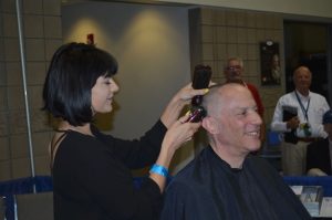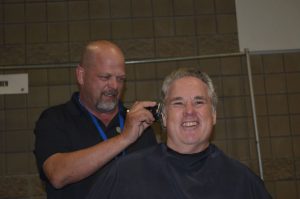 Harrison, of the popular History’s Pawn Stars television program and the Las Vegas Gold & Silver Pawn Shop (www.gspawn.com), made the first pass of the electric cutter on Standish’s head and was among those who presented a donation check.