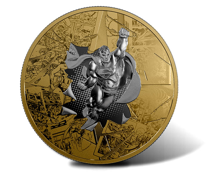 "Traditional engraving brings Bronze Age Superman to life as he bursts through the laser-engraved comic book panels," describes the Royal Canadian Mint.