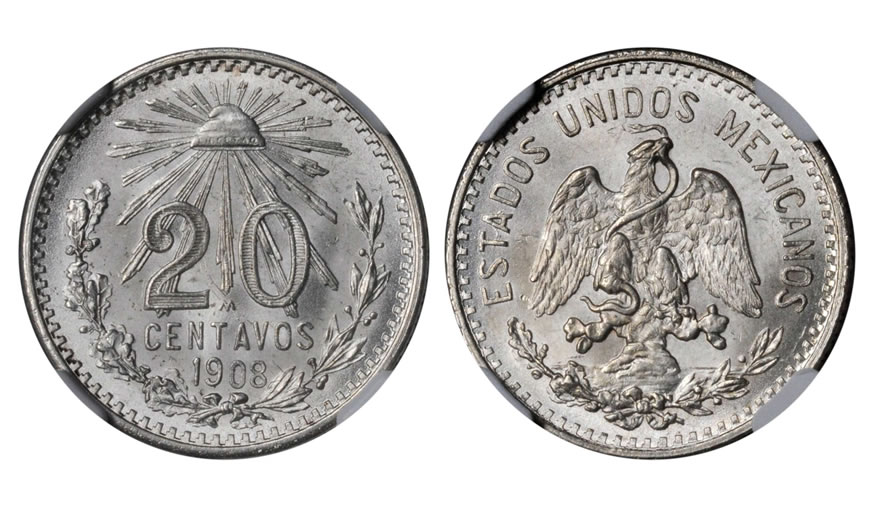 A highly desirable "MX" Mexican 8 Reales from the beginning of Pillar coinage (lot 21160) realized $17,625. This piece was one of many highlights from a substantial selection of premium Mexican numismatic items. Lot 21264 featured another great Mexican rarity, the finest certified 1908 20 Centavos, which hammered at $12,337.