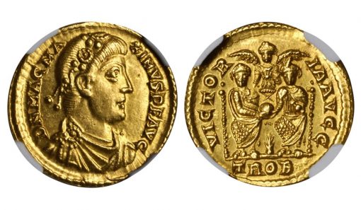 The ancient coins featured a pair of Euainetos Decadrachms, one of which was from signed dies. Lots 20006 and 20007 realized $37,600 and $15,275 respectively. Lot 20105, a superb Mint State solidus of the Roman Emperor Magnus Maximus, garnered $10,575.