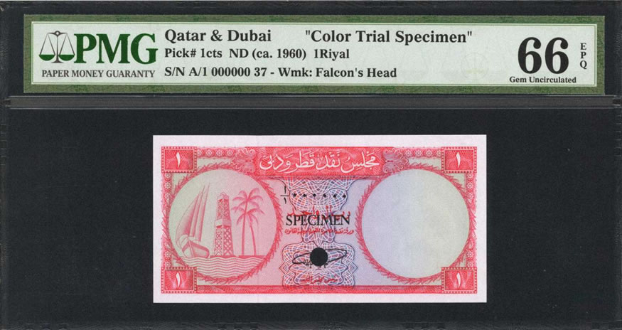 A strong performance for world paper money was observed in Australian notes with a group of Specimens from Pick 41s to 48s all reaching high estimate or better, for over $21,500 in total hammer value. These Specimens have been off the market for quite some time and are sure to be treasured in their new homes. The Qatar and Dubai Color Trial set (lot 30354) reached the highest price point of the sale realizing $58,750.