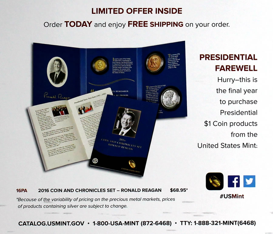 In addition, the 2016 Ronald Reagan Coin & Chronicles Set is still for sale (see photos of the set) as is the 2013 Theodore Roosevelt Presidential Discovery Set.