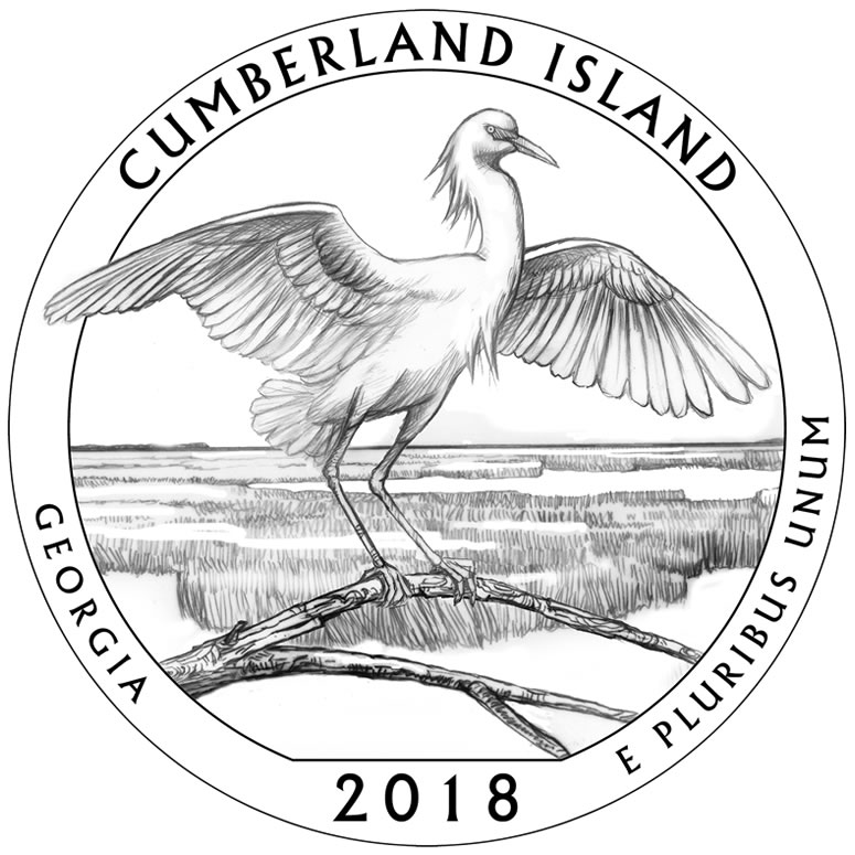 The design shows a snowy egret perched on a branch on the edge of a salt marsh, ready for flight. Inscriptions are "CUMBERLAND ISLAND," "GEORGIA," "2018" and "E PLURIBUS UNUM."