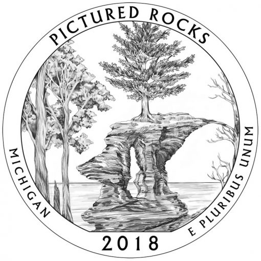 The design depicts Chapel Rock and the white pine tree that grows atop with the inscriptions "PICTURED ROCKS," "MICHIGAN," "2018" and "E PLURIBUS UNUM."