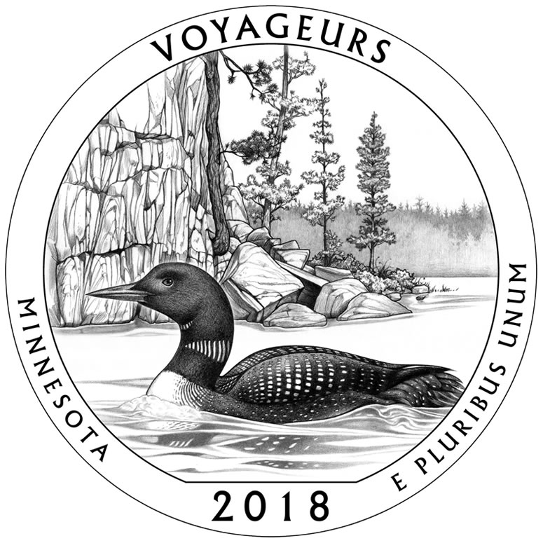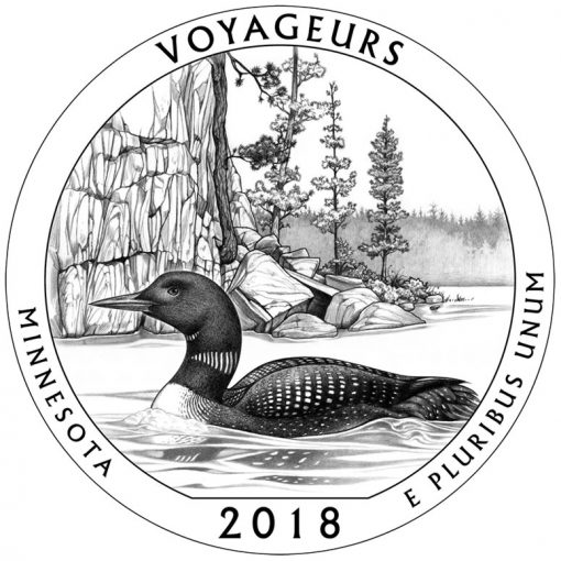 The design depicts a common loon with a rock cliff in the background and the inscriptions "VOYAGEURS," "MINNESOTA," "2018" and "E PLURIBUS UNUM."