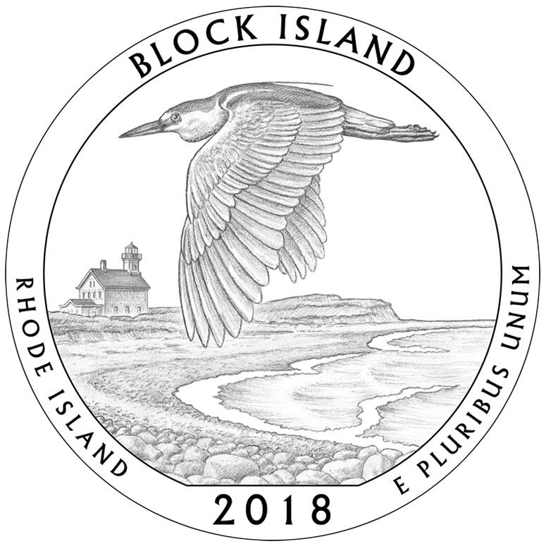 The design depicts a black-crowned night-heron flying over a view from the beach at Cow Cove looking towards Sandy Point. The North Lighthouse is seen in the background. Inscriptions are "BLOCK ISLAND," "RHODE ISLAND," "2018" and "E PLURIBUS UNUM."