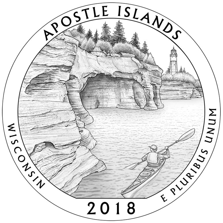The design shows the sea caves at Devils Island with the lighthouse in the background and a kayaker paddling in the foreground. Inscriptions are "APOSTLE ISLANDS," "WISCONSIN," "2018" and "E PLURIBUS UNUM."