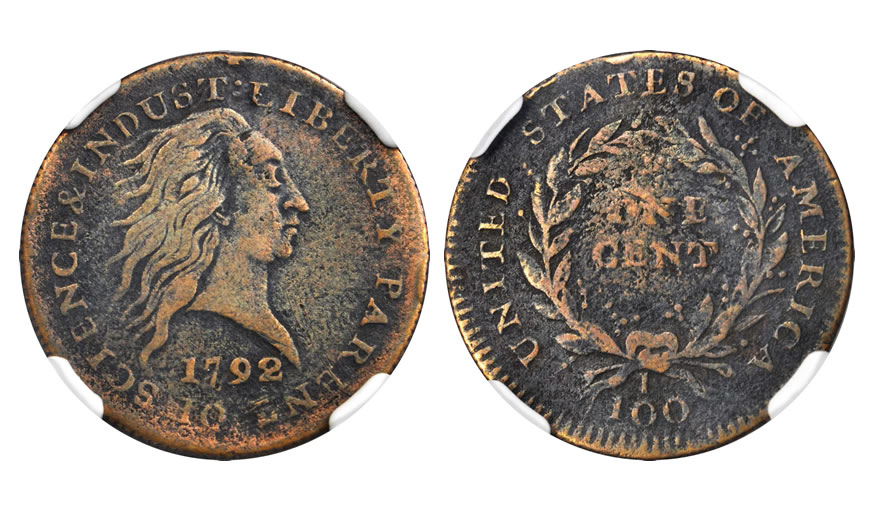 A bold example of the rare 1792 Judd-2 copper cent was presented in lot 2004, the fifth finest of fewer than 10 survivors known. Certified Fine-15 (NGC) and approved by CAC, this specimen was bid up to $235,000.