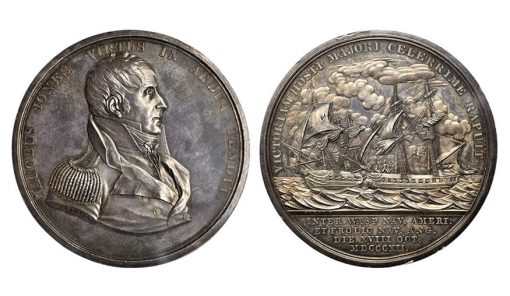 A selection of significant medals highlighted the Numismatic Americana that inaugurated the sale on Tuesday, August 1. Lot 7 presented a rare original striking of the 1812 Captain Jacob Jones medal in silver. Certified MS-63 (NGC) and previously sold as part of the Dreyfuss Collection in Bowers and Merena’s sale of April 1986, this piece realized $19,975 in the 2017 Denver auction.