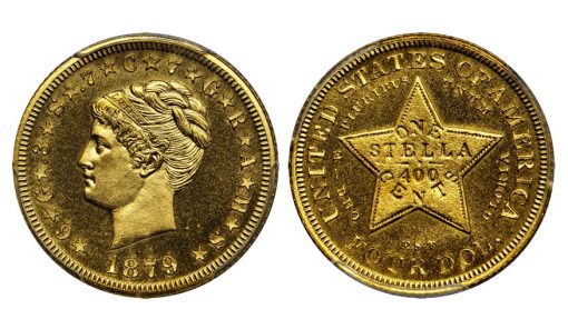 A pair of four-dollar Stellas was featured in lots 2173 and 2174, showcasing the gold and gilt-copper variants of this popular pattern. Lot 2173 was a gorgeous Proof-64 (PCGS) 1879 Flowing Hair example that brought $158,625, while the Rarity-7- Gilt 1879 Coiled Hair specimen in lot 2174 realized $129,250.