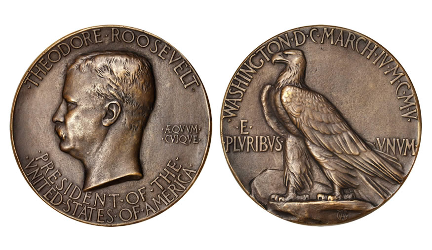 An example of the legendary 1905 Roosevelt Inaugural medal by Augustus Saint-Gaudens, presented in lot 34, exhibited the scarce plain edge without the Tiffany mark. Ranked number 27 in the 100 Greatest American Medals and Tokens (Whitman Publishing, 2007), this rare plain edge variant brought $28,200.