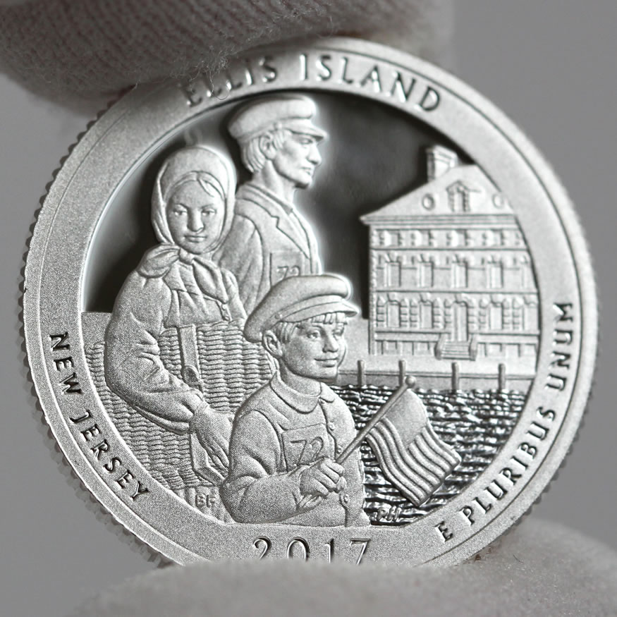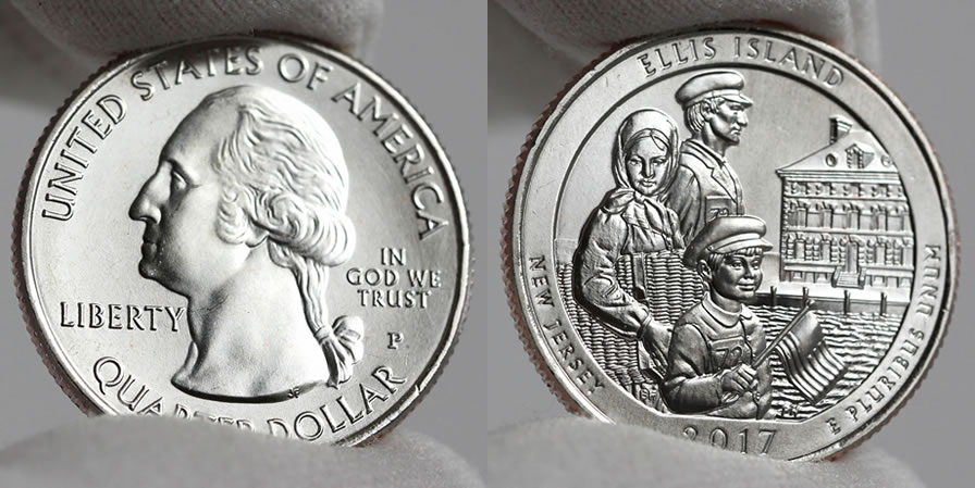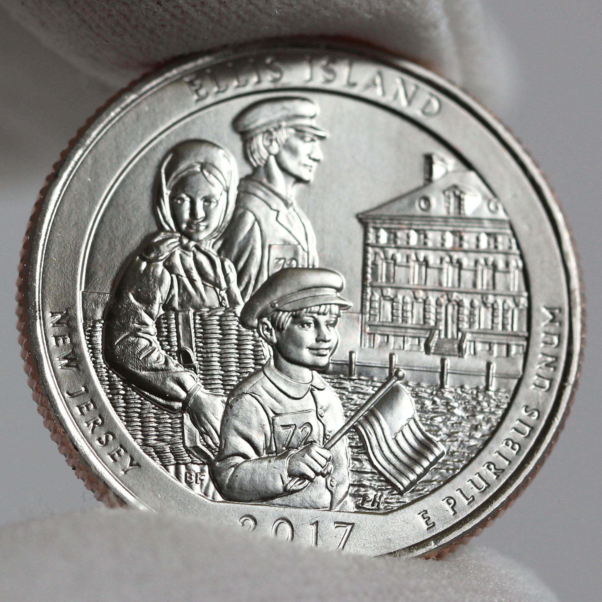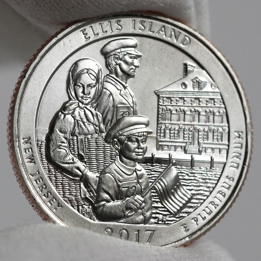 Designed by Barbara Fox and sculpted by Phebe Hemphill, the Ellis Island quarter depicts an immigrant family approaching the island with a mixture of hope and uncertainty. It was selected after refinements following a review of candidate designs in late 2015. Inscribed around the design are ELLIS ISLAND, NEW JERSEY, 2017 and E PLURIBUS UNUM.