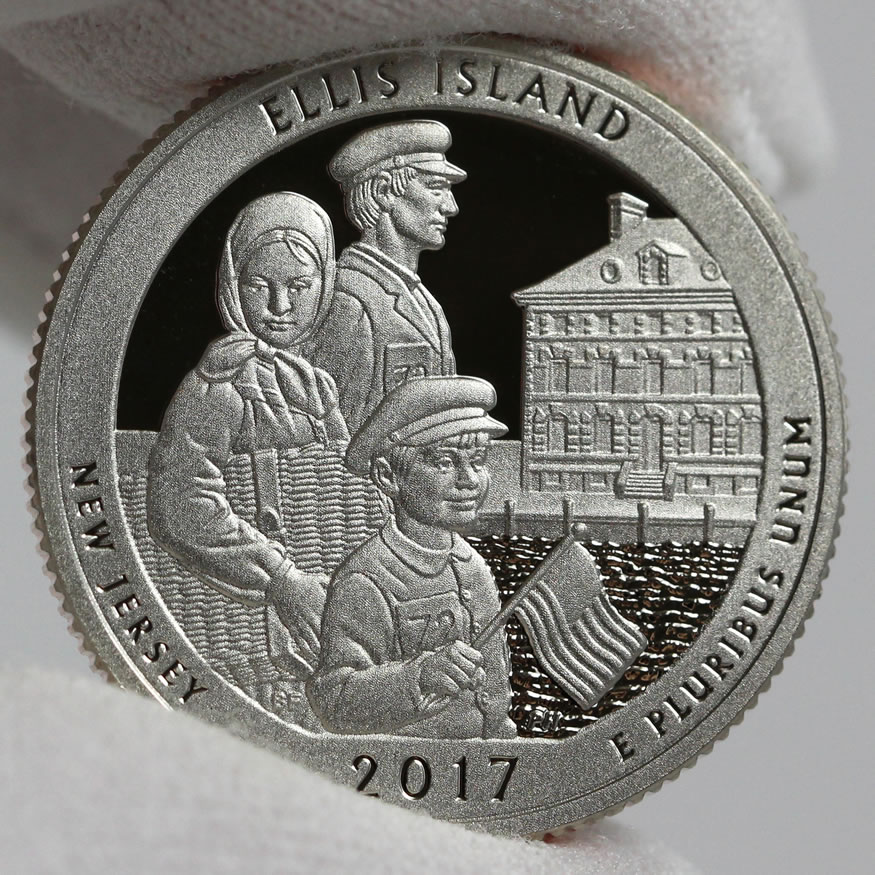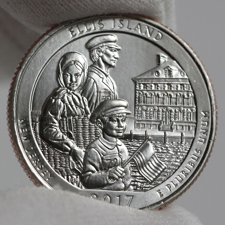 This article presents photos of New Jersey’s Ellis Island quarter, the fourth of this year’s five coins from the United States Mint’s series of America the Beautiful Quarters®.