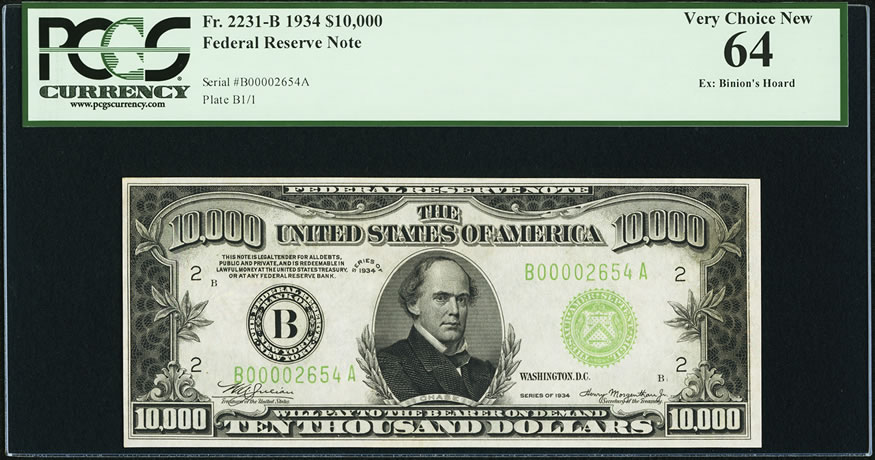 A 1934 $10,000 Federal Reserve Note, PCGS Very Choice New 64 sold for $144,000 to lead $5.4 million in auction totals for the Long Beach event’s currency auction.
