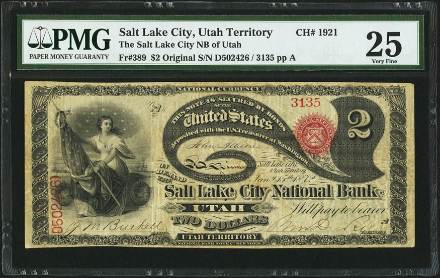 A scarce $2 denomination from The Salt Lake City National Bank of Utah hammered for $60,000. The rare specimen stands out as not only a $2 bill but was also offered at auction for the first time in 100 years. The auction’s selection realized a 96 percent sell-through rate.