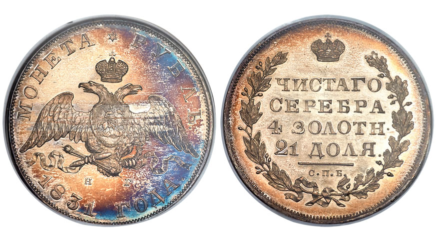 An extraordinarily rare 1831 Russian Proof Rouble, PR64 NGC — one of only four pieces certified by NGC and PCGS combined — sold for $45,600 to take top-lot honors among world coins. A 1900 Russian Nicholas II Proof Rouble, PR65 Cameo NGC sold for $38,400 as the single best-known example of four known to exist. The auction of world and ancient coins resulted in a strong 96 percent sell-through rate.