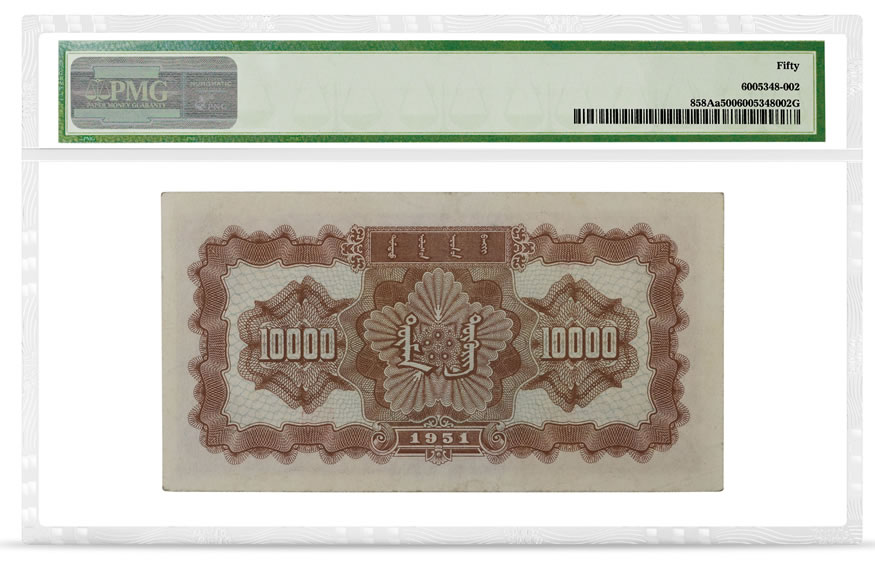 Paper Money Guaranty® (PMG) certified a rare, high-denomination banknote from the early years of the People’s Republic of China. The 1951 10,000 Yüan note is attributed as Pick 858Aa (Pick refers to the catalog numbers originally developed by Albert Pick and used by the Standard Catalog of World Paper Money) and graded PMG AU 50.