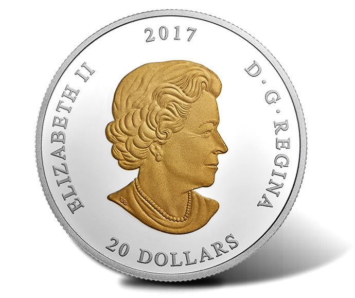 Inscriptions surrounding the gold-plated portrait are ELIZABETH II, 2017, D G REGINA, and 20 DOLLARS.