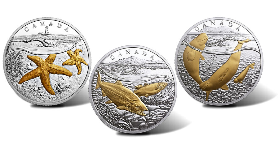 The Mint’s "From Sea To Sea To Sea" collection includes three 1 oz. silver coins that depict in gold-plating the Atlantic starfish, the Pacific Salmon and the Arctic beluga whale.