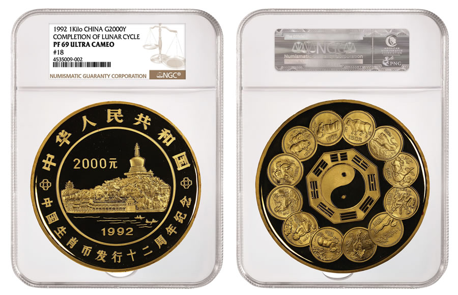 Among the top coins of the Hercules Collection are two impressive gold coins, each weighing one kilogram (32.15 troy ounces). The large-sized coins, a 1992 Completion of the Lunar Cycle Gold 2,000 Yuan and a 1995 Return of Taiwan Gold 2,000 Yuan, are tied for finest certified of their types at NGC PF 69 Ultra Cameo.