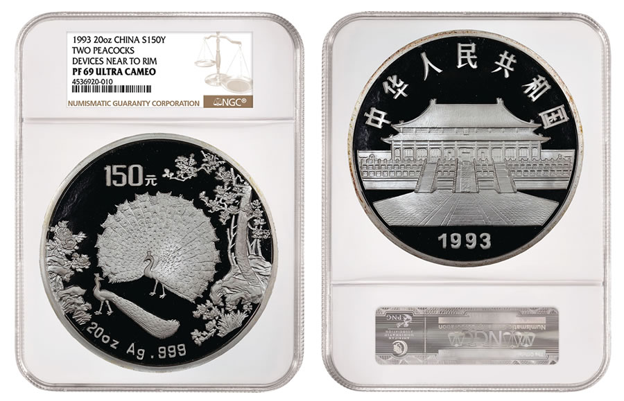 Another large-sized highlight is a 1993 Two Peacocks, Devices Near to Rim, Silver 150 Yuan that weighs 20 ounces and is graded NGC PF 69 Ultra Cameo. It is only the second example of this rare and valuable type to be certified by NGC.