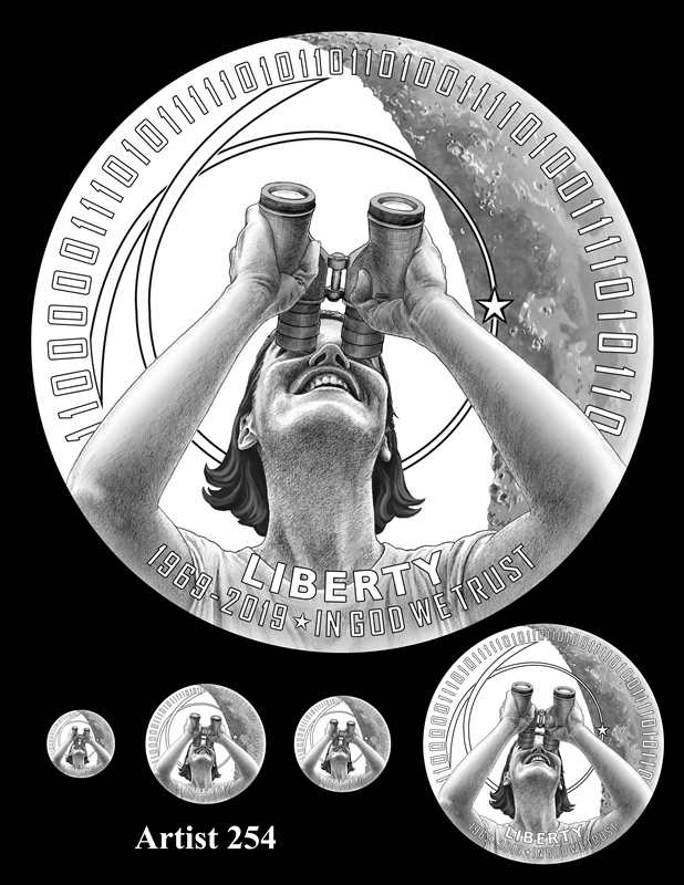 This obverse design shows a woman peering up into the sky with binoculars with the Moon in the background. On the Moon, a star indicates the Apollo 11 landing site, with a circular path coming from and returning to a series of 1s and 0s around the perimeter. The inscriptions "1969-2019," "LIBERTY," and "IN GOD WE TRUST" appear at the bottom.
