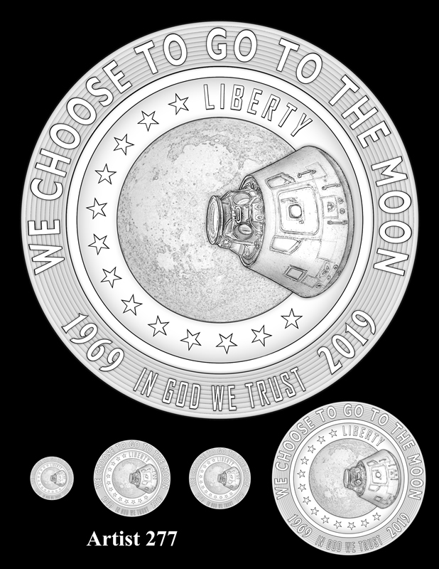 The design evinces three astronauts from the three programs, shoulder to shoulder. One is in a Mercury spacesuit, one in a Gemini suit and one in an Apollo suit (specifically a Block I spacesuit — discontinued after Apollo 1 — a somewhat unique and different look to complement the reverse of the coin that highlights Apollo 11’s classic Block II visor. The astronauts all look to the ultimate goal, the Moon, and the achievement, "For All Mankind." There are 21 stars, denoting the 21 manned missions previous to the landing and the breadth of the American manned space program.