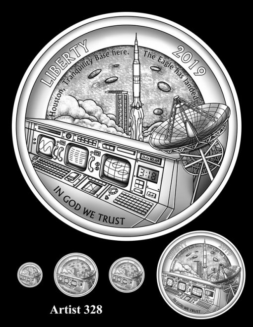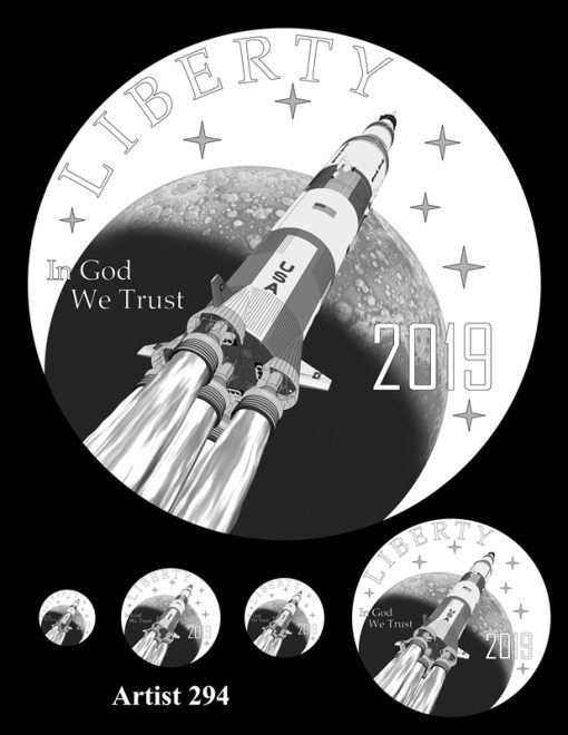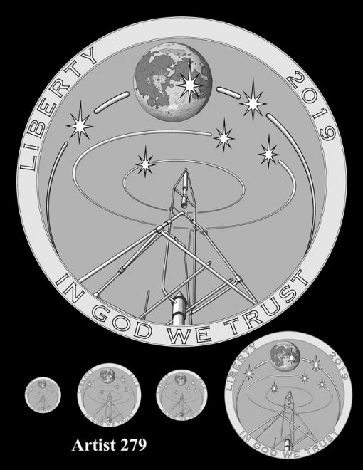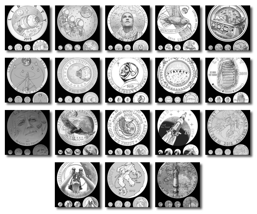 The United States Mint has unveiled all the candidate designs for the Apollo 11 Commemorative Coins. In 2019, the U.S. Mint will release $5 gold coins, silver dollars, clad half-dollars, and 5-ounce $1 silver coins honoring the 50th anniversary of the first manned moon landing.