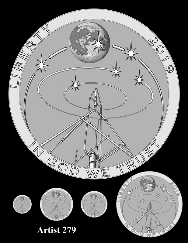 The artist desired for the overall image to be suggestive of peering through the eyepiece of a telescope, a concave form that is meant to echo the obverse design’s concave surface.
