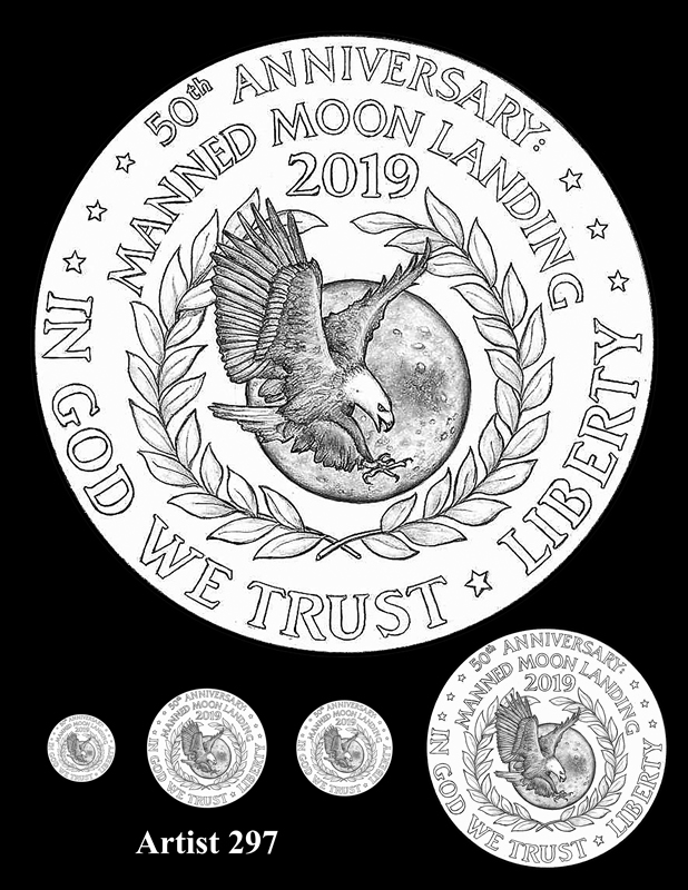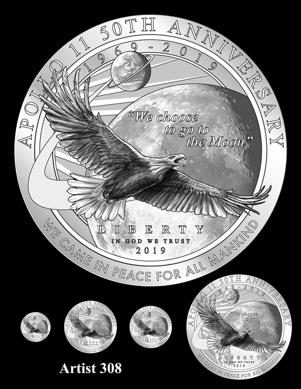 When I started contemplating the assignment for the 50th anniversary coin celebrating Apollo 11, the words of "The Eagle has landed" was an irresistible picturesque image; the American eagle landing on the Moon.