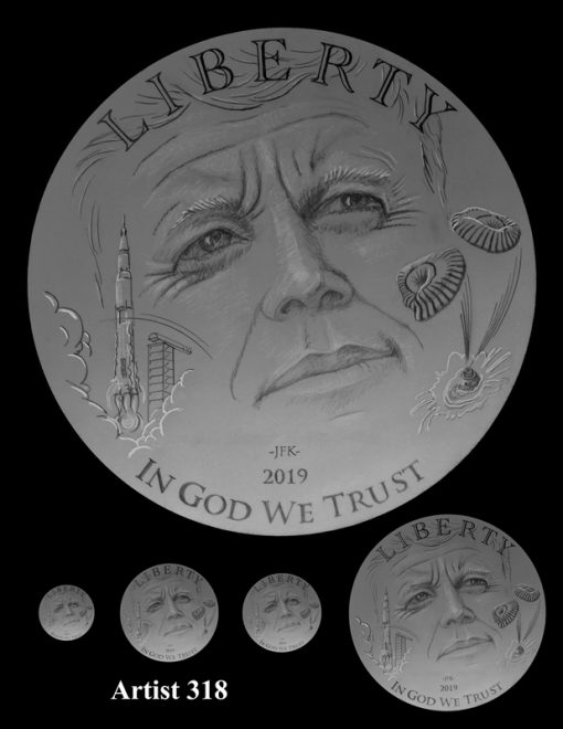 The design intent of this coin’s obverse side is to give tribute to the presidential vision that inspired our country to achieve in less than a decade perhaps the greatest achievement by all mankind.