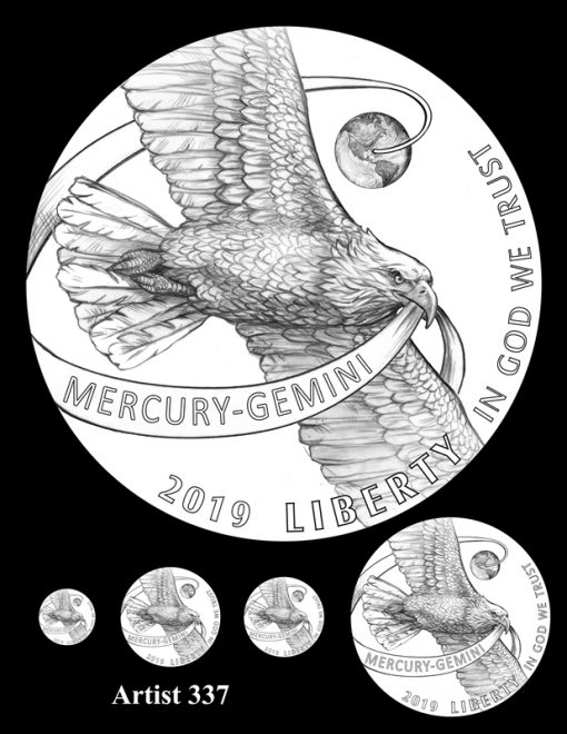 This eagle is on a determined mission. It flies forward carrying a banner in his beak with the names of the two NASA programs, Mercury (1958-1963) and Gemini (1961-1966) whose engineering innovations and successes led up to the manned landing on the Moon.