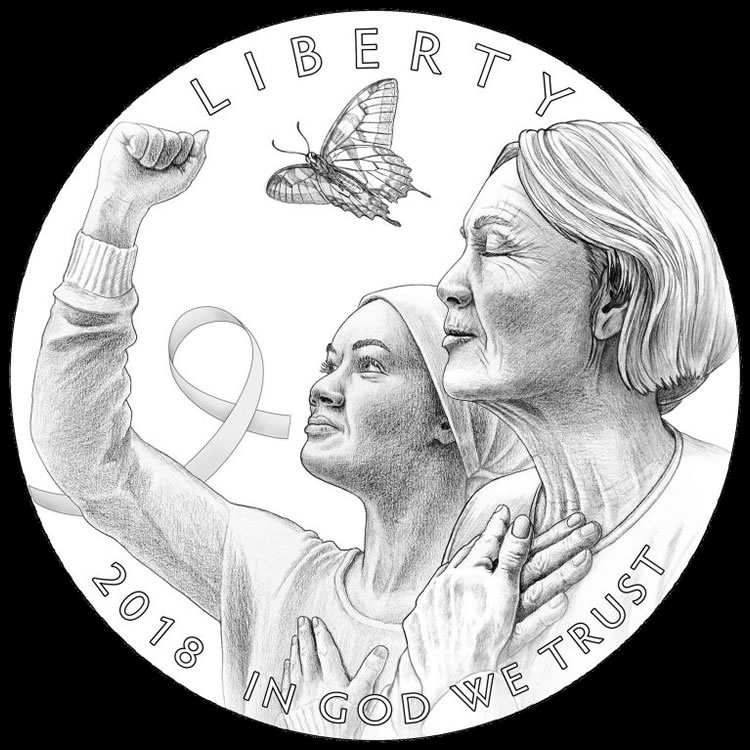 Beginning on March 15, 2018, the U.S. Mint will sell up to 50,000 $5 pink gold coins, 400,000 silver dollars and 750,000 clad half-dollars. Pricing details will become available closer to the coins’ release. Under the terms of the law, a surcharge of $35 per gold coin, $10 per silver dollar and $5 per clad half-dollar will be added to each coin sale with collected funds paid to the Breast Cancer Research Foundation (www.bcrfcure.org) for furthering research.