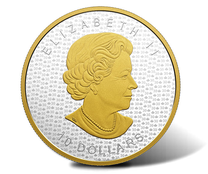Both sides of the coin feature fields with a repeating pattern of a micro-sized maple leaf with the number "30."