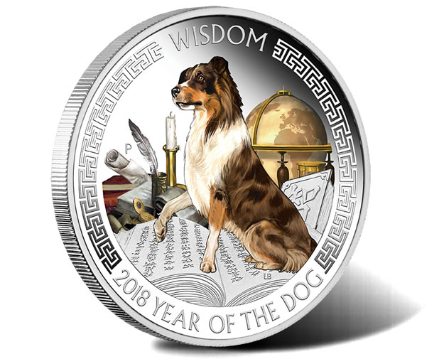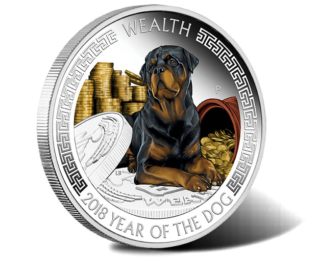 Colored depictions of a Rottweiler and a Border collie grace the reverses of these two coins which are sold within a set. Representing wealth, the Rottweiler is shown lying on a large coin with a stack of gold coins behind it.