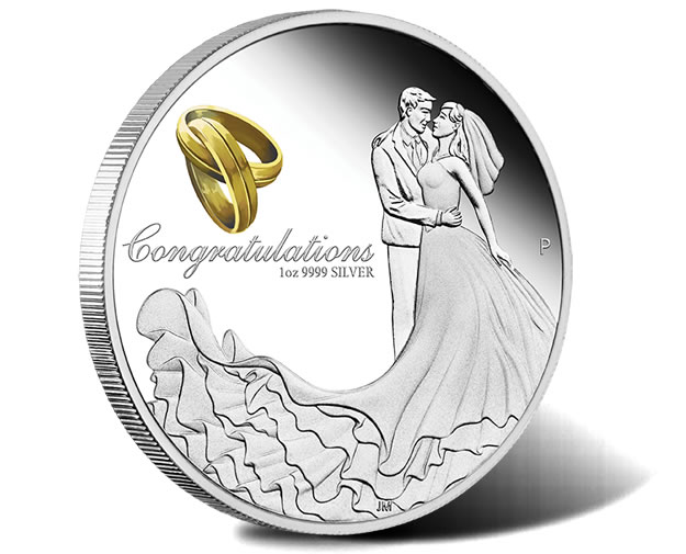 Celebrating the newlyweds of 2018, The Perth Mint is now offering a 1oz 99.99% pure silver coin emblematic of the special occasion. Its reverse (tails side) shows a bride and a groom with the bride’s dress flowing around the design. Two golden rings are added in a special intertwined image.