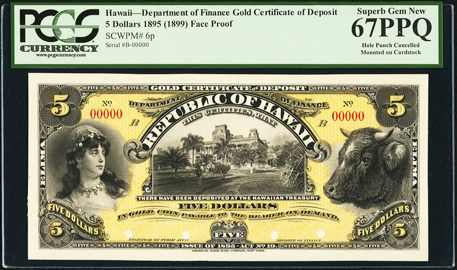 Another Hawaii Department of Finance $5 1895 (1899) Pick 6p Face Proof (est. $10,000 to $15,000) features the classic golden design from the Series B Gold Coin issue. There was another subsequent gold coin series, but all features in that series were executed in blue.