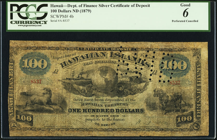 A Hawaii Kingdom of Hawaii $100 ND (1879) Pick 4b (est. $15,000 to $25,000) is the highest denomination of the first series. This is a particularly rare example — even more so than proofs or specimens — because fewer of these high denominations were released.
