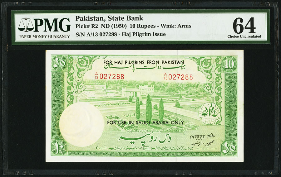 This Pakistan State Bank of Pakistan Haj Pilgrim Issue 10 Rupees ND (1950) Pick R2 (est. $15,000 to $20,000) may well be the finest Haj Pilgrimage 10 Rupees note from the first Pakistani issue, and was printed for use in Saudi Arabia by Pakistan’s attending Haj.