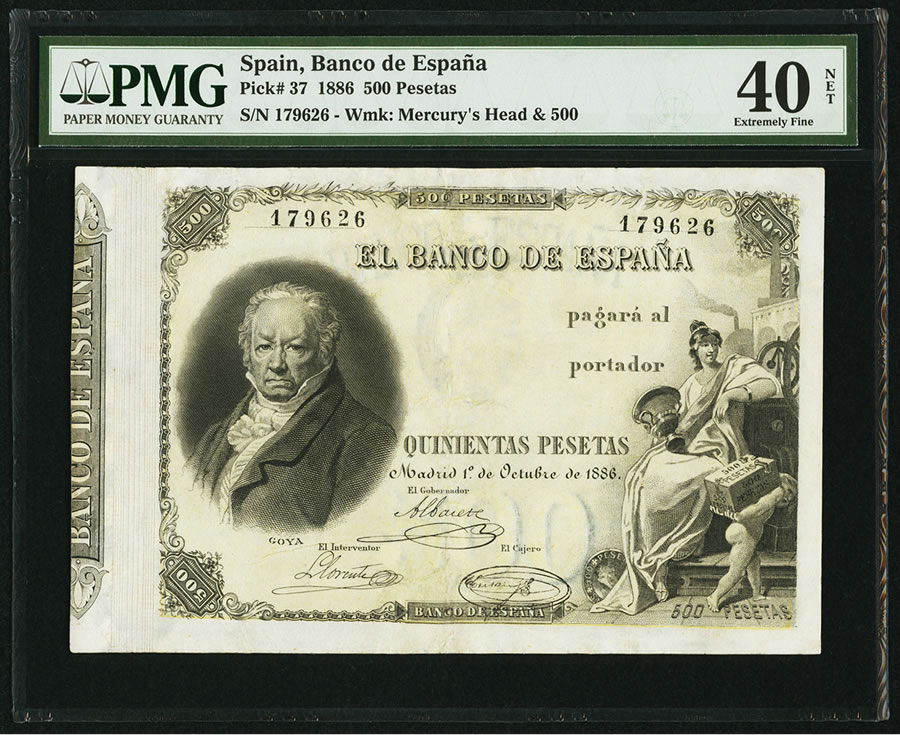 A Spain Banco de Espana 500 Pesetas 1.10.1886 Pick 37 (est. $20,000 to $30,000) is extremely difficult to find in any grade range, much less an example at PMG Extremely Fine 40 Net.