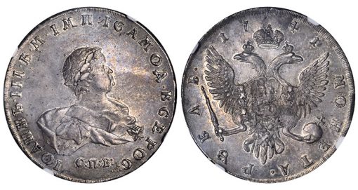 Highlights among Russian coins include a Tynf and a Ruble of Peter I (the Great) as lots 21319 and 21321 respectively. The tragedy of the young emperor Ivan VI makes for compelling reading, with this story told in lots 21327 and 21328. The first is an exceptionally rare Ruble issue of the already scarce Ivan, featuring an obverse legend that extends further underneath the bust. The second is one of the first Rubles struck by Elizabeth, who usurped the throne from young Ivan and hurriedly began striking her own coinage.