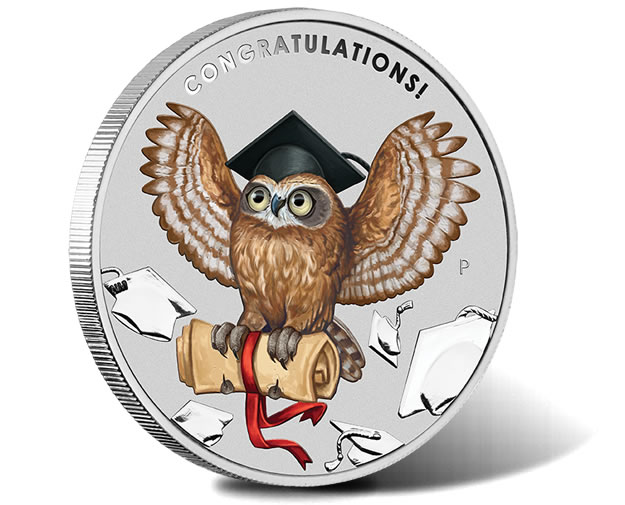 Celebrate achievements in education with this coin designed for a graduation gift. It showcases an owl wearing a mortar board mid-flight with a scroll in its talons. The design includes five mortar boards in the background.