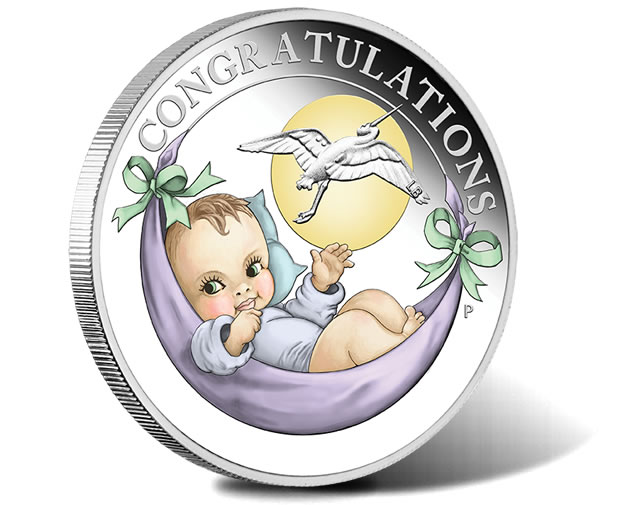 This newly designed 2018-dated coin is great way to celebrate the arrival of a newborn baby. It features a baby resting in a blanket with the fabled stork flying in the background.