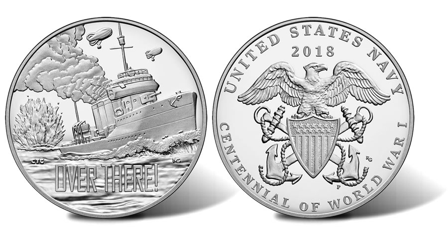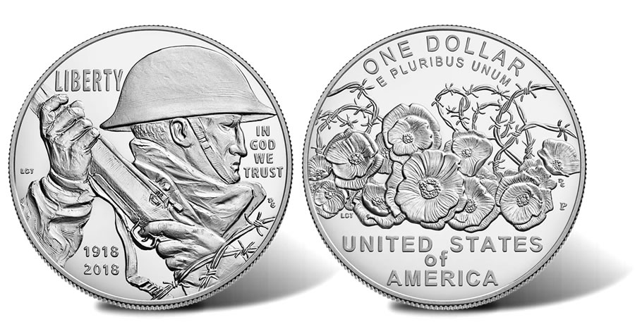 They include a 2018 Proof WWI Centennial Silver Dollar, a 2018 Uncirculated WWI Centennial Silver Dollar and five associated sets. The sets contain a proof WWI silver dollar and silver medals honoring branches of the U.S. Armed Forces that were active in the First World War — the Army, the Navy, the Air Service, the U.S. Marines and the U.S. Coast Guard.