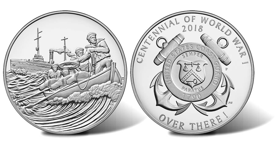 The reverse features the World War I-era Coast Guard emblem, with the inscriptions CENTENNIAL OF WORLD WAR I, 2018, and OVER THERE! Phebe Hemphill also executed the design for medals.
