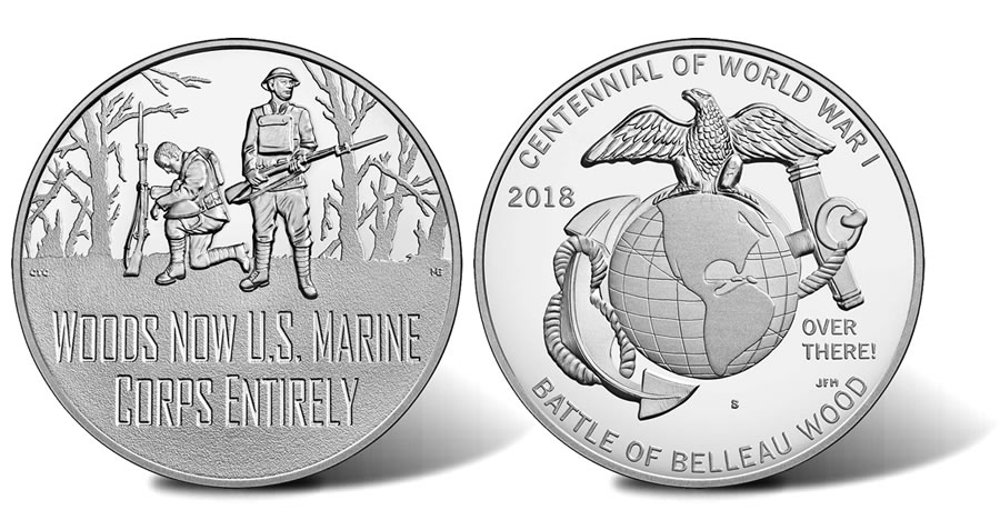 The reverse features the World War I-era version of the Eagle, Globe, and Anchor emblem with the inscriptions CENTENNIAL OF WORLD WAR I, 2018, OVER THERE!, and BATTLE OF BELLEAU WOOD. Joseph Menna executed the design for medals.
