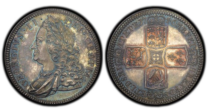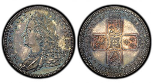 The earliest proof set of England consists of four silver coins of King George II dated 1746. Only 100 sets were minted. Proof coins had never previously been assembled as complete sets and sold by the Royal Mint. The 1746 set consists of the crown, half crown, shilling and sixpence coins. All are certified and graded by PCGS, and the crown is graded PR-66, certainly one of the finest known. All the 1746 proof coins shimmer with original golden blue iridescent toning.